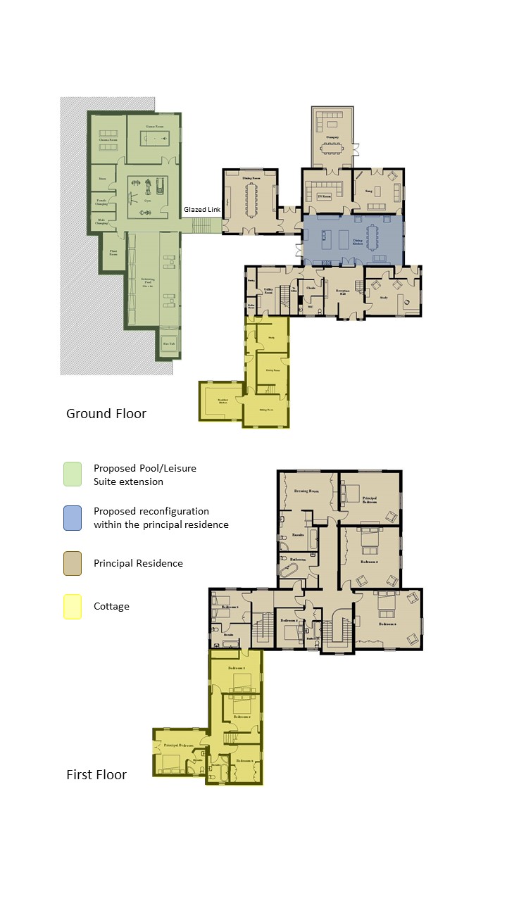 The current owners have obtained planning permission for the addition of a leisure suite to be accessed from the principal residence via a glazed link. This substantial extension will include a swimming pool with separate hot tub and changing facilities, a gymnasium, new games room and cinema room. The approved scheme also allows for the reconfiguration of the principal residence with the existing dining room and drawing room being combined to form an impressive family living kitchen, the existing kitchen will become a lounge, the sitting room will become a snug and the games room a dining room. The first floor layout will remain as existing. See floor plans for details.