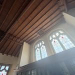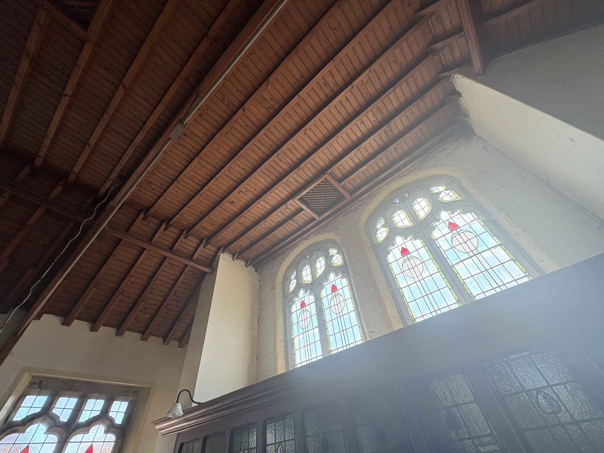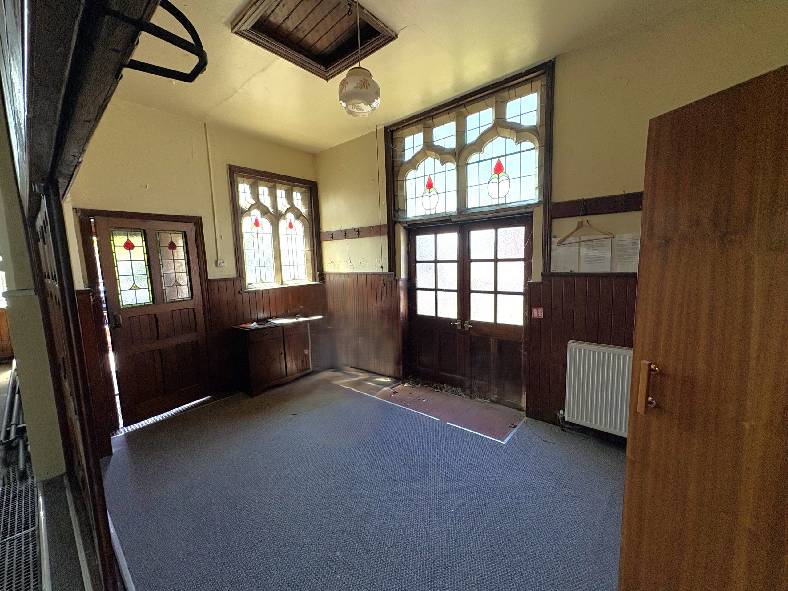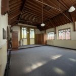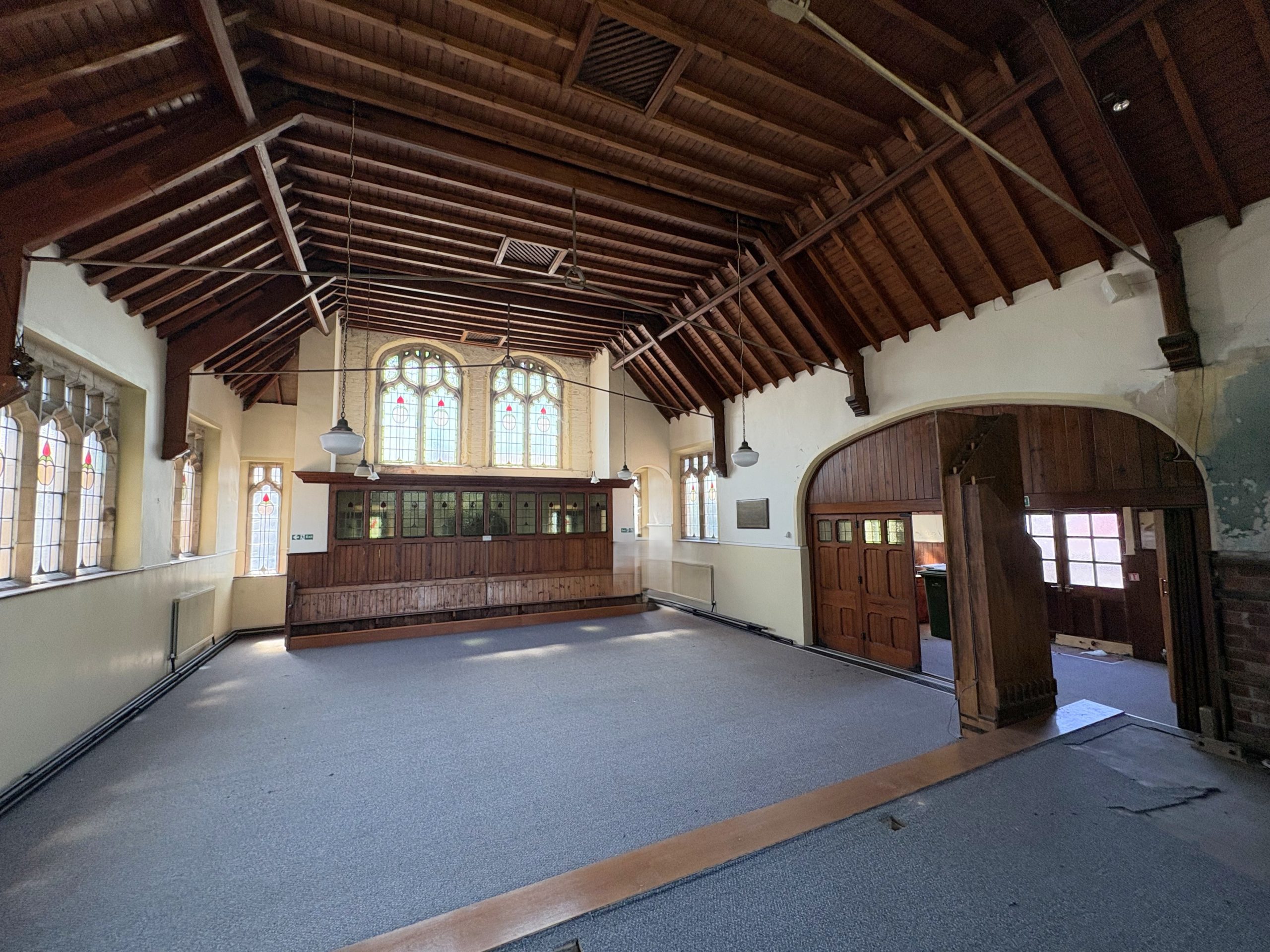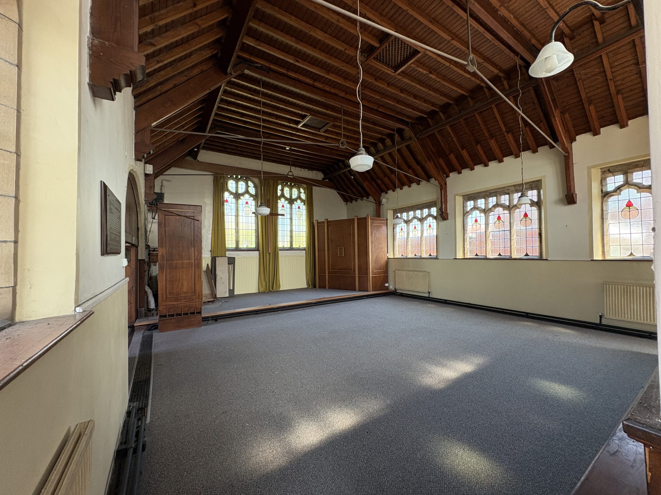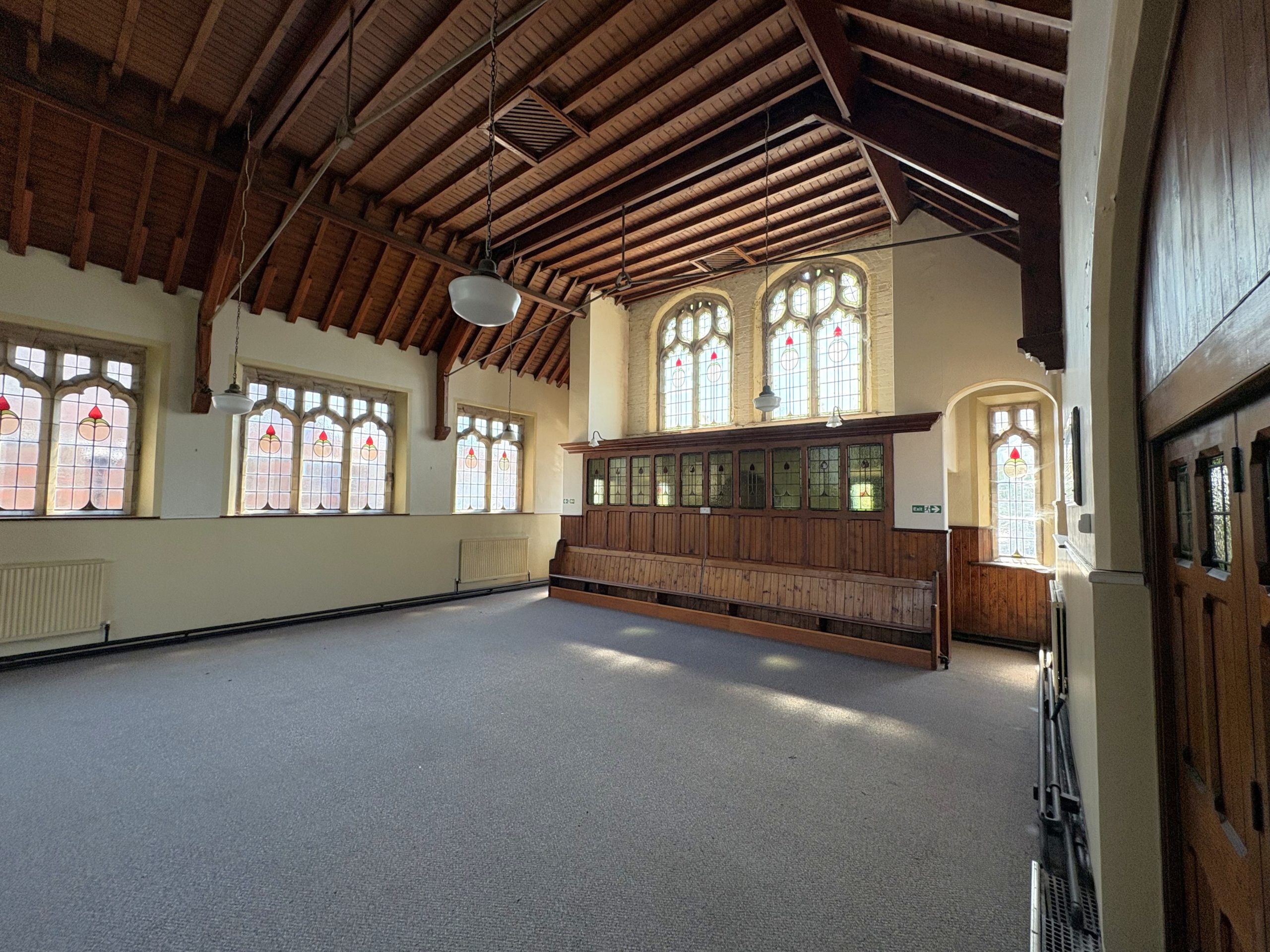The Main Hall is of generous proportions (10.23m max x 7.88m max) having feature coloured glass windows and an impressive exposed pitch pine roof structure .