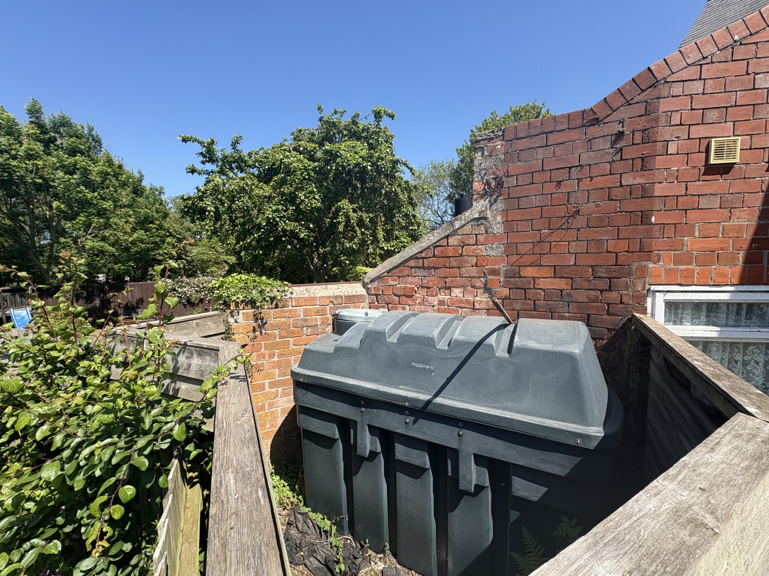 Outside, there is a gravel surfaced parking space and path to one side with an oil tank serving the central heating boiler at the far end. The building forms the boundary to the north and east elevations.
