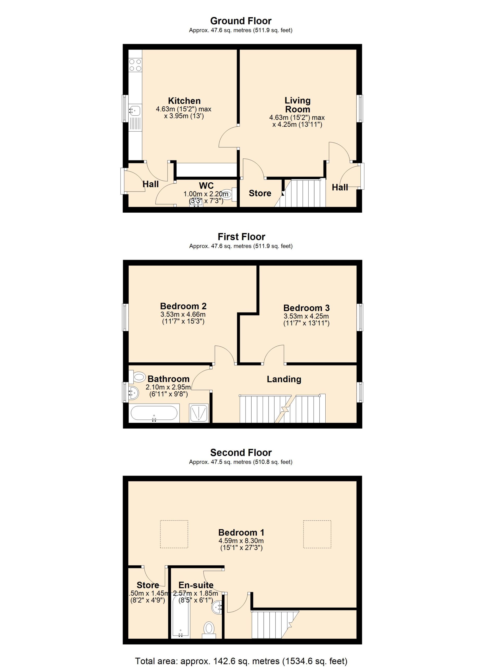 Total approximate gross internal floor area (excluding restricted headroom) 117 m² (1259 ft²) each.