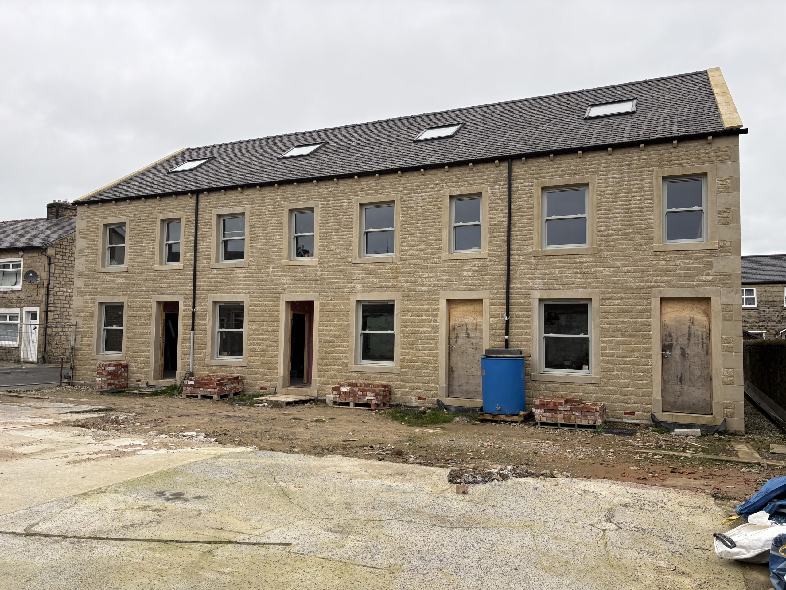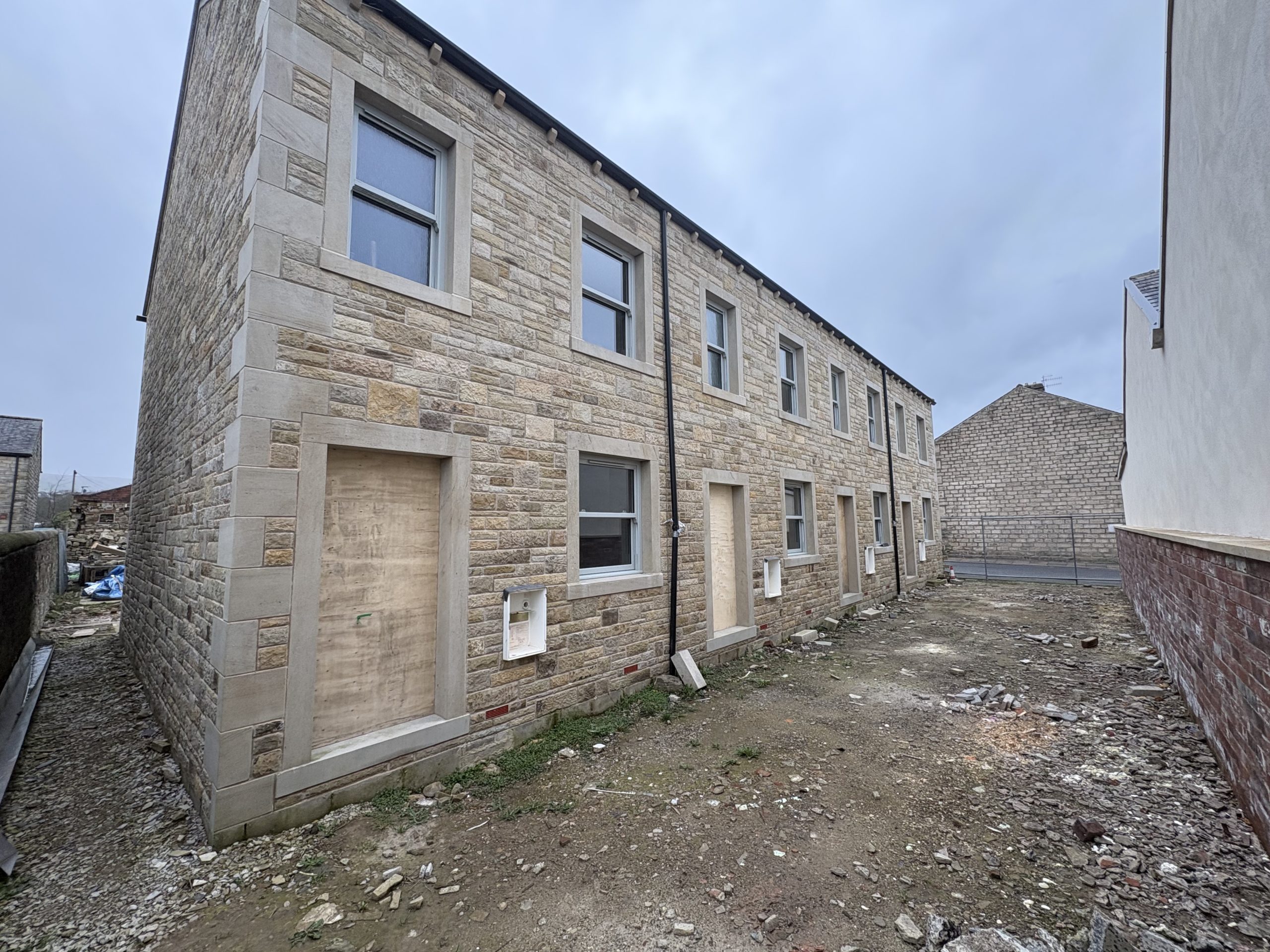 Following discharge of conditions, part of the site has been cleared and a terrace of four three bedroom houses constructed to a high standard. The complete terrace is weather tight including windows installed with internal works progressing from first fix.